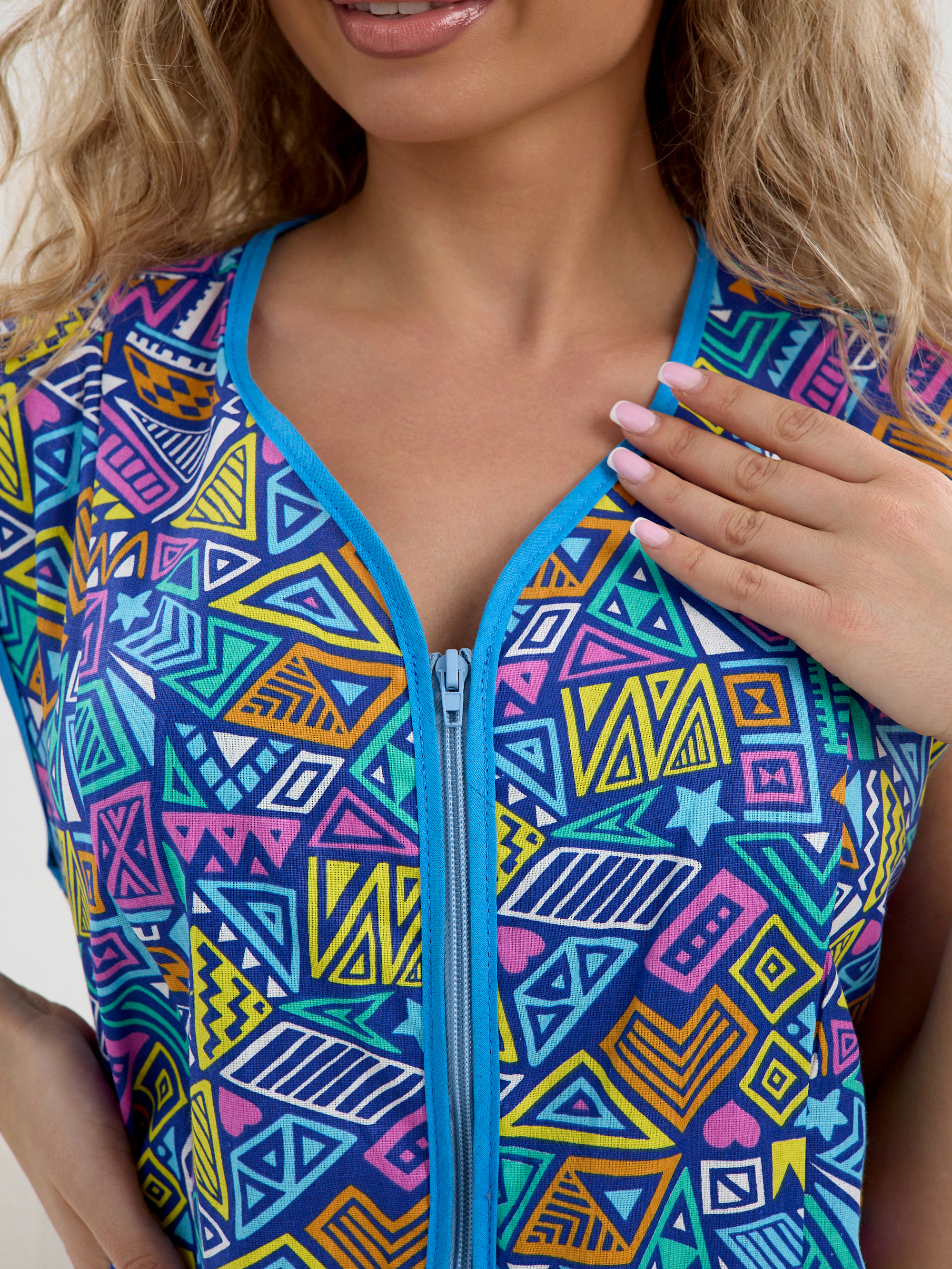 Халат женский домашний бязевый на молнии без рукава от компании Лето-Текс,выполнен из натурального хлопчатобумажного материала из бязи - 100% хлопок. Длина халата выше колена, карманы накладные. Достоинствами такого халата являются его экологичность и безопасность, он не вызывает аллергии, кожа в нем дышит, а влага впитывается. Отлично подойдет в качестве одежды для дома, надеть с утра или после ванны, не сковывает движений и свободно сидит по фигуре. Халат летний женский короткий безрукавный подойдет для роддома, для кормления грудью, для кормящих мам.