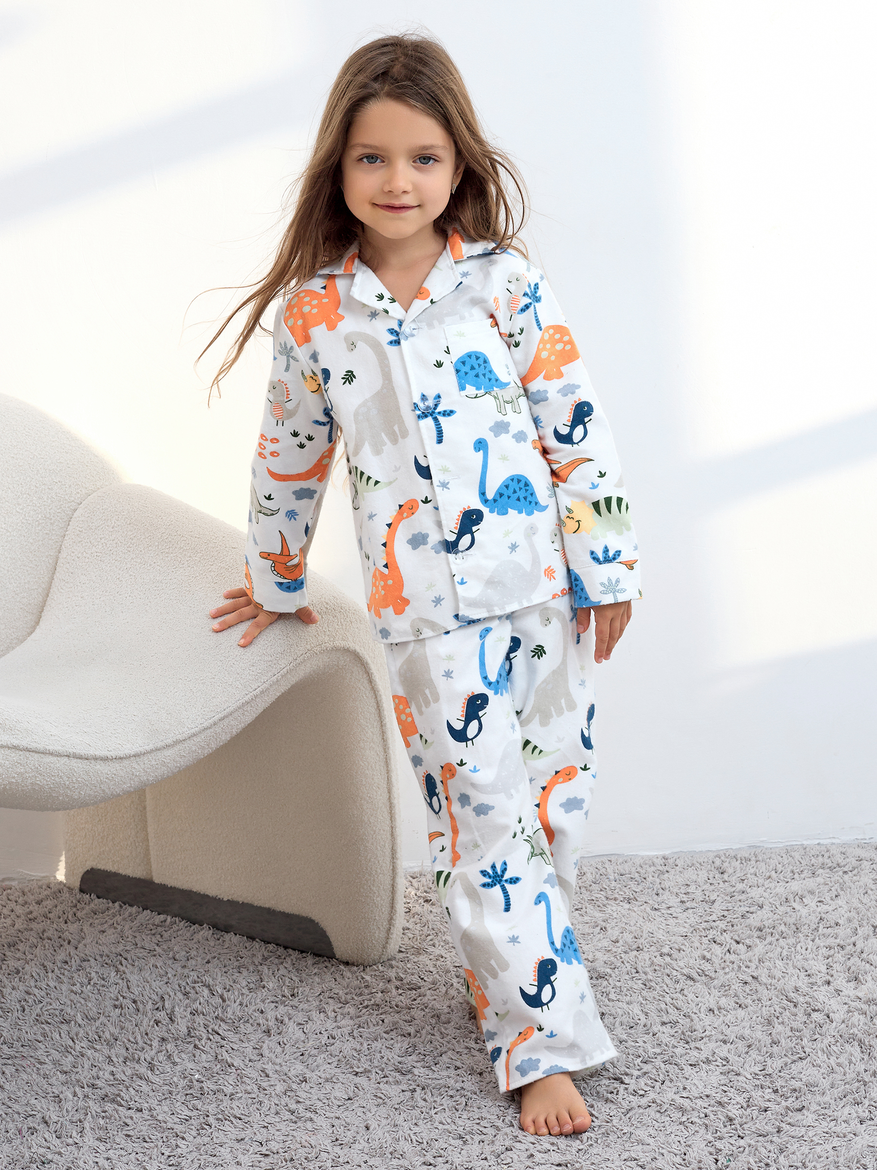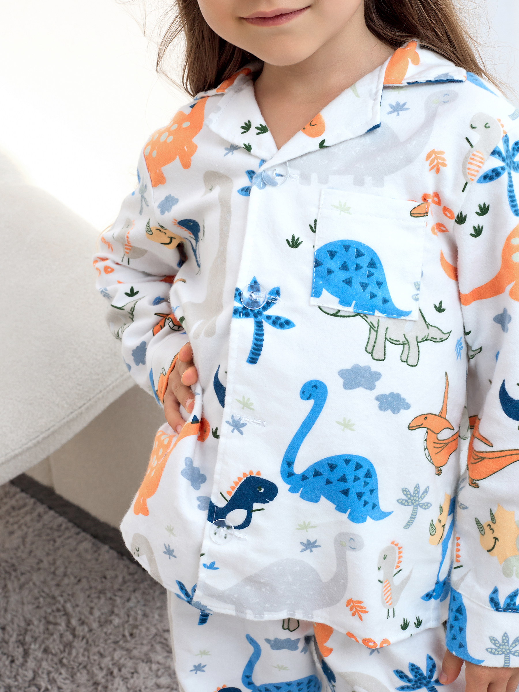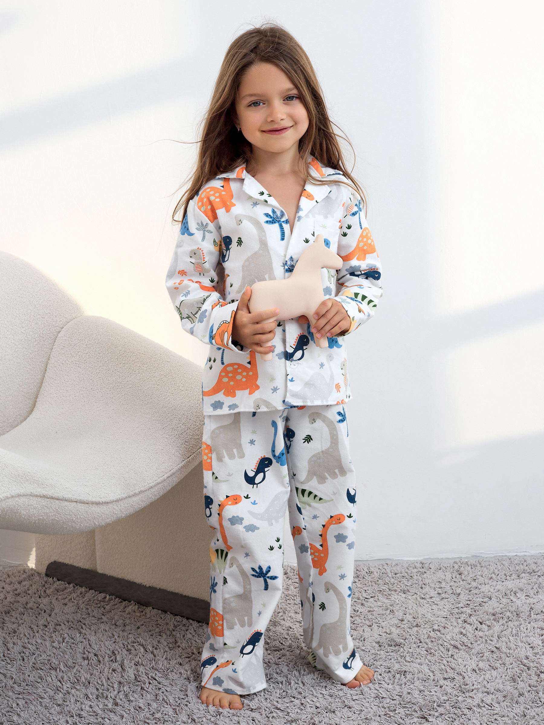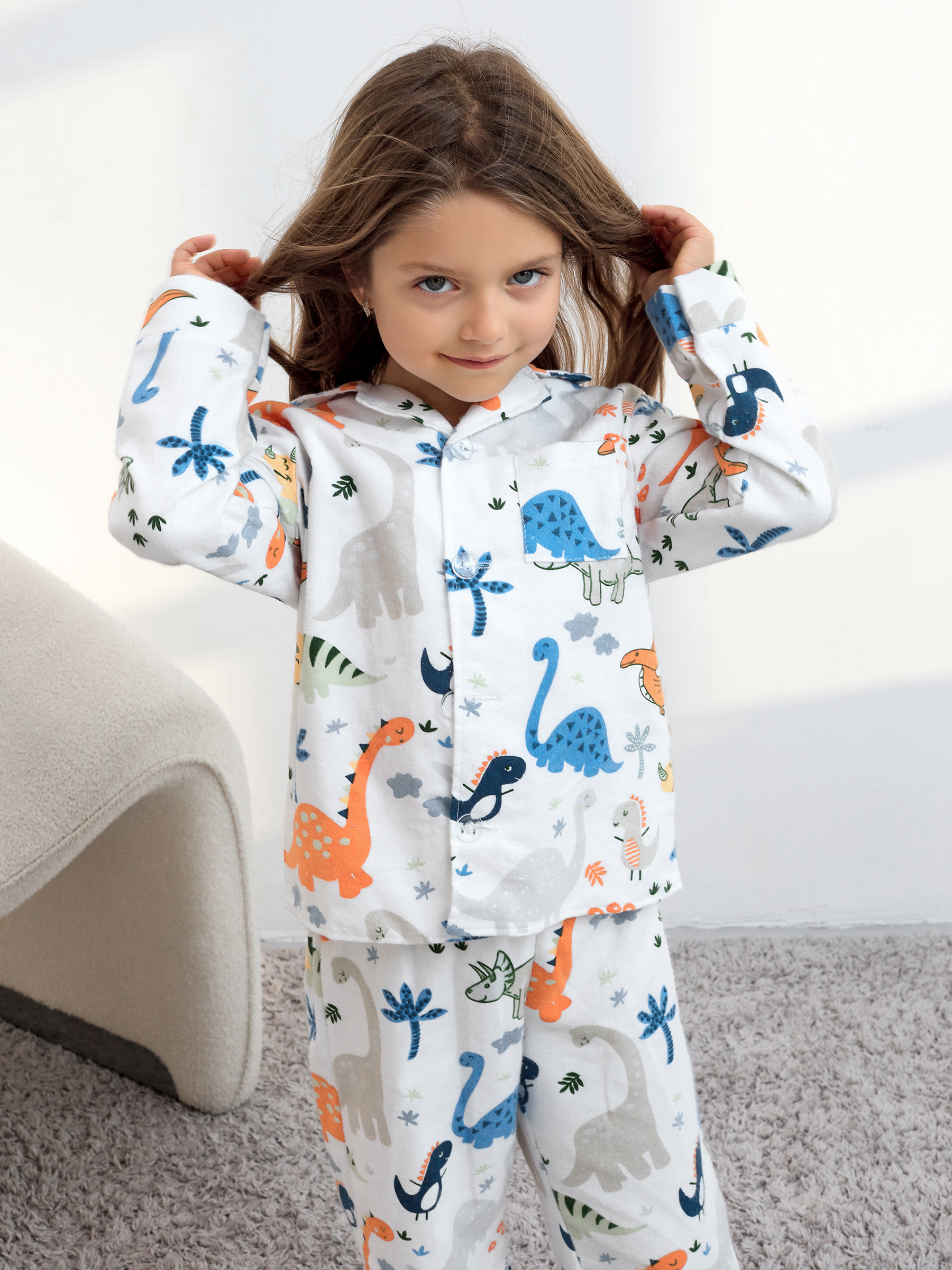 Пижама детская свободного кроя не будет стеснять движения во время активных, а также спокойных игр дома, состоит из длинных свободных штанов на резинке и рубашки с длинным рукавом на пуговицах.