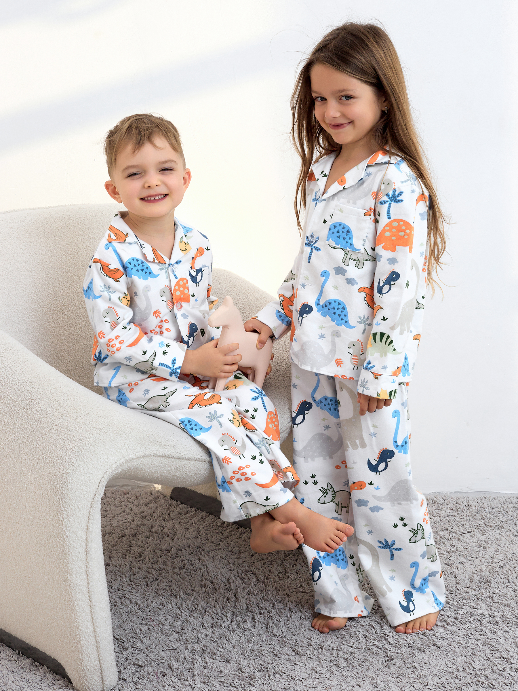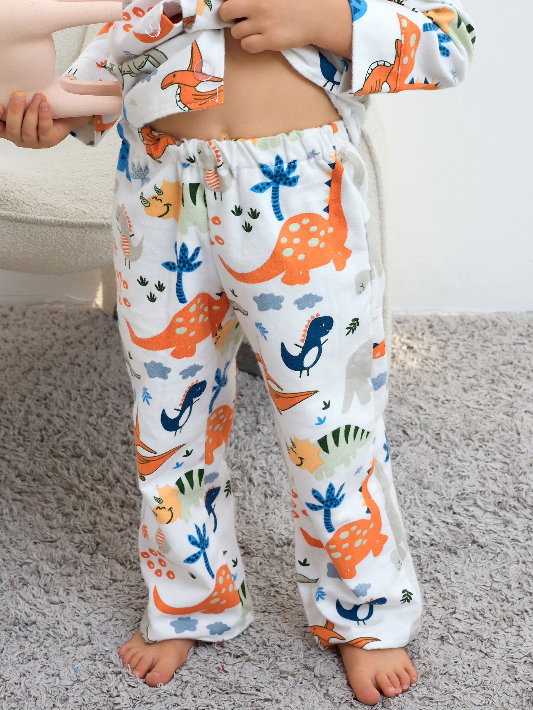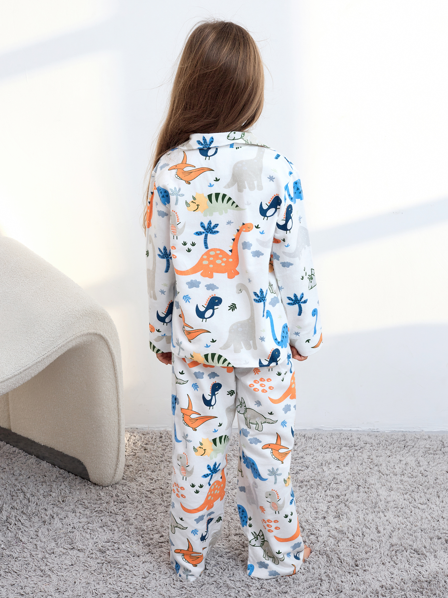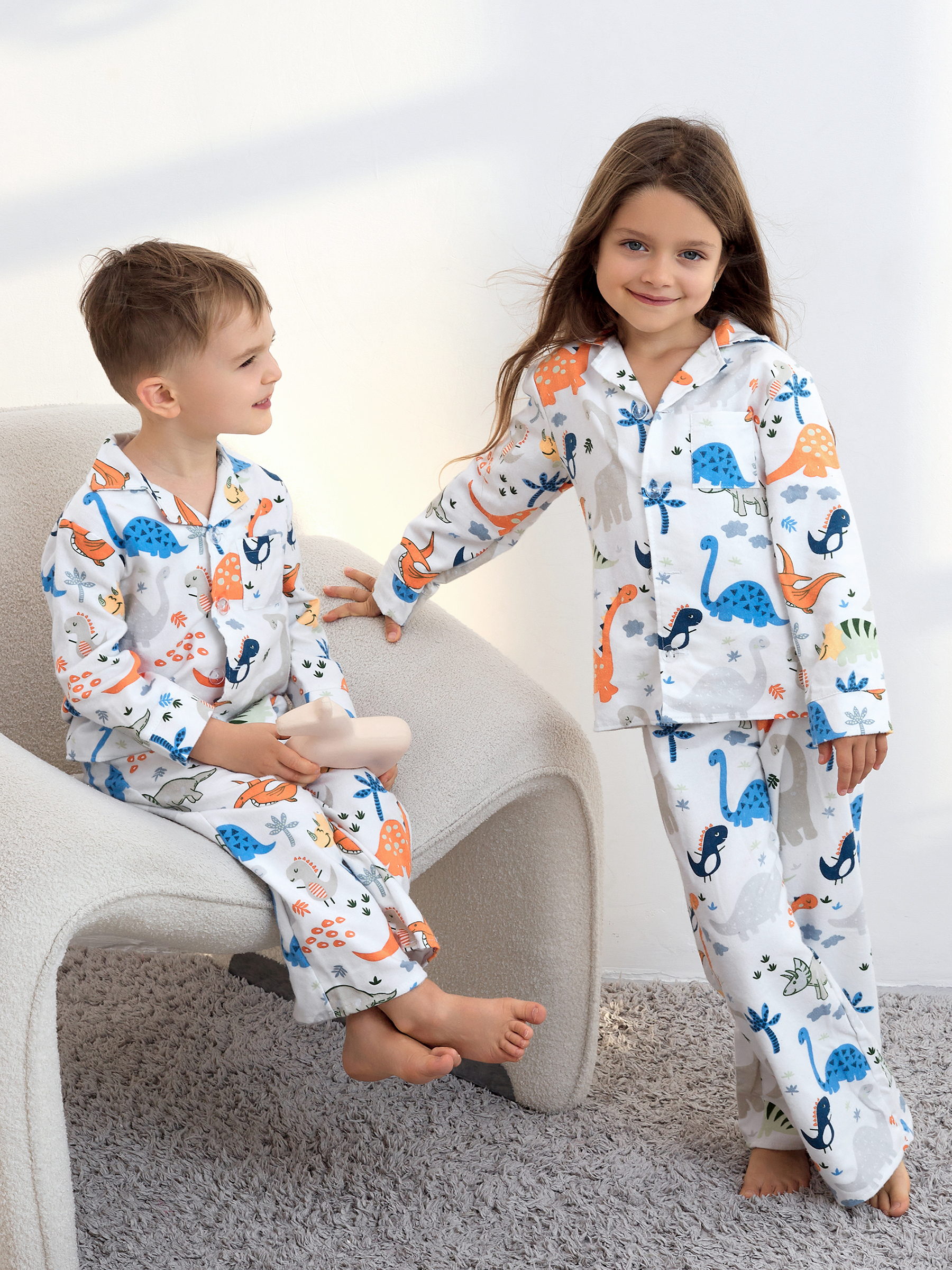 Пижама детская свободного кроя не будет стеснять движения во время активных, а также спокойных игр дома, состоит из длинных свободных штанов на резинке и рубашки с длинным рукавом на пуговицах.